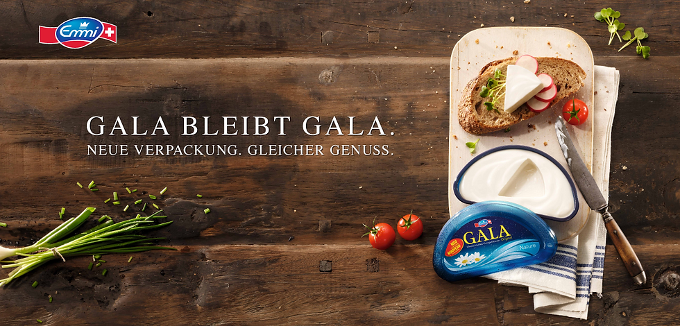 Gala Käse ist seit über hundert Jahren in der markanten Dreiecksform erhältlich. Zusätzlich zu dieser wurde jetzt eine zeitgemässere Verpackung für eine jüngere Zielgruppe entwickelt. Natürlich mit dem gleichen Inhalt. Die Kampagnen-Motive kommunizieren es daher simpel wie prägnant: Neue Verpackung. Gleicher Genuss. Oder kürzer: Gala bleibt Gala.